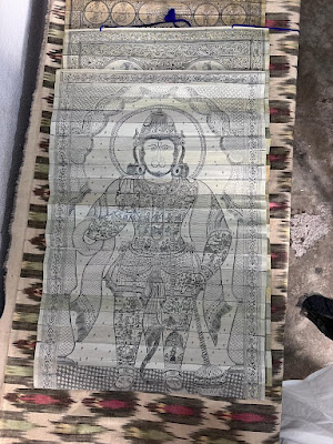 പ്രത്യേകം നിർമ്മിച്ചെടുത്ത പനയോലകളിൽ നാരായം കൊണ്ട് വരഞ്ഞ്, അതിനു മുകളിൽ മഷി പുരട്ടി, നിരവധി കലാസൃഷ്ടികൾ അദ്ദേഹം നിർമ്മിച്ചിരിക്കുന്നു. രാമായണവും ഹനുമാനും ഭഗവതിയുമെല്ലാം ആ പനയോലകളിൽ അനുഗ്രഹം ചൊരിയുന്നു. തികഞ്ഞ ആതിഥ്യമര്യാദയോടെ അദ്ദേഹം ഞങ്ങളെ അകത്തേക്ക് ക്ഷണിച്ചു. തൻ്റെ പ്രവൃത്തിയും അതിന്റെ അദ്ധ്വാനവും എല്ലാം അദ്ദേഹം വിവരിച്ചു തന്നു. ഇത് വരയ്ക്കുന്ന രീതി ഞങ്ങൾക്ക് നേരിട്ട് പരിചയപ്പെടുത്തിത്തന്നു. ഇങ്ങിനെ ഒരു കല ഉപാസിക്കുന്ന എത്ര പേരുണ്ട് എന്നെനിക്കറിയില്ല. പക്ഷെ ഓരോ ദിവസവും തന്റേതായ ഈ കലോപാസന അദ്ദേഹം തുടരുന്നു.ഹിരാപ്പൂരിന് കുറച്ചകലെയുള്ള ഗ്രാമത്തിലാണ് അദ്ദേഹത്തിൻറെ വീട്. ഭാര്യയും മക്കളും എല്ലാം ഇതിൽ സഹായിക്കും. ചില കുട്ടികൾ പഠിക്കാൻ വരുന്നുണ്ട്. ഭാര്യയാണ് അവർക്ക് പറഞ്ഞുകൊടുക്കുന്നത്. ഇത് കൂടാതെ പല തരം കരകൗശലവസ്തുക്കളും അവിടെ പ്രദർശനത്തിനുണ്ട്. വലിയ പനയോലച്ചിത്രത്തിന് രണ്ട് മാസം വരെ അദ്ധ്വാനം വേണ്ടിവരും. ഒന്നാലോചിച്ചു നോക്കൂ.. രണ്ട് മാസത്തോളം ഒരേയൊരു ലക്ഷ്യവുമായി നടക്കുന്ന ഒരു മനുഷ്യൻ. അങ്ങിനെ മാസങ്ങളും വർഷങ്ങളും. ഇത്തരം തപസ്സ് തന്നെയാണ് കലാകാരന് ആദരവ് നേടിക്കൊടുക്കുന്നത്. കേരളത്തിൽ ചില പ്രദർശനങ്ങൾക്ക് വേണ്ടി അദ്ദേഹം വന്നിട്ടുണ്ട്. കൊച്ചിയിലും മറ്റും. ഇവിടെ നിന്ന് യേശുക്രിസ്തുവിനെ ഇങ്ങിനെ പനയോലയിൽ വരക്കാനുള്ള നിർദ്ദേശം അദ്ദേഹം സ്വീകരിച്ചില്ല എന്നും അദ്ദേഹം സംഭാഷണമദ്ധ്യേ സൂചിപ്പിച്ചു. ഒരുപക്ഷെ അന്നാട്ടിൽ കണ്ട വ്യാപകമായ മതപരിവർത്തനശ്രമങ്ങളാകാം അതിന് കാരണം.
